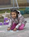 A photograph of an event for Art Fund at Piccadilly Gardens, Manchester in which a young girl draws flowers in chalk on the pavement