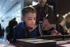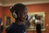 A photograph of an event for Art Fund at Manchester Art gallery, Manchester in which a young boy watches a presentation while wearing headphones