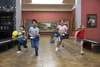 A photograph of an event for Art Fund at Manchester Art gallery, Manchester in which a group of children run through the gallery towards the gallery