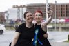 A photograph taken at Art Fund’s Museum of the Year awards at the Museum of Liverpool in which two women from the Beamish Museum, who won that years prize, take a selfie outside the museum