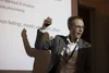 Lecturer gesturing in front of a projected slide during a conference at Manchester Metropolitan University.
