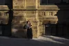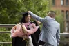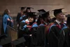 Father adjusting his daughter’s mortar board after her graduation at Manchester Metropolitan University.