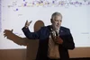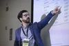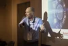 Man gesturing at a projection during a conference at Manchester Metropolitan University.