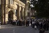 Crowd queuing to enter a graduate art show at the Holden Gallery, Manchester Metropolitan University.