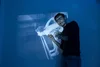 Artist performing in front of a projected video work during an event at Manchester Metropolitan University.