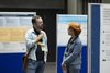 Two academics discussing in front of poster displays during an academic conference at Manchester Metropolitan University.