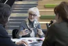 Older woman in discussion during a conference workshop at Manchester Metropolitan University.