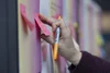 Conference delegate placing a post-it note on a display board at Manchester Metropolitan University.