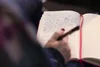 Close-up of a woman taking notes during a conference at Manchester Metropolitan University.