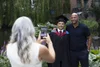 Young graduate in cap and gown looking at a selfie with her parents at Manchester Metropolitan University graduation.